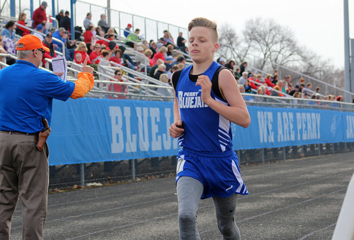 Perry's Calvin Sass crosses the line with one lap remaining in the 3200 run April 12.