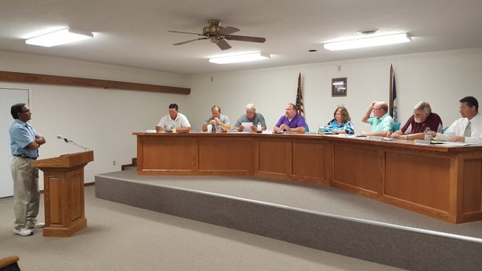 Ashvin J. Patel, left, addresses the Woodward City Council at the Aug. 14, 2017, meeting. Patel has previously served four terms on the Woodward City Council and now seeks to return to the council.
