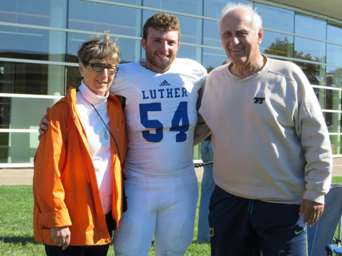The reason for the younger VanKirk’s visit to the Jasper county school was football, as the former Perry standout is a linebacker for Luther College, and the Norse were in town to battle the Pioneers. As Grinnell is shorter drive from Perry than Decorah, the chance for a brief family reunion was simply too good to pass up.