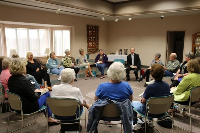 George Minot led the discussion Tuesday night of the 2017 All Iowa Reads book, “Bottomland,” by Iowa author Michelle Hoover in the Perry Public Library’s large meeting room.
