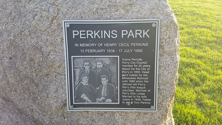 The entrance to the 3.2 acre park, which lies within Wolling’s third district, is at W. Fifth Street and Dewey Avenue and features a dedicatory stone with plaque to Henry Cecil Perkins, longtime Perry City Council member and former Perry mayor. Soccer fields with parking are accessed at North and McLuen streets.