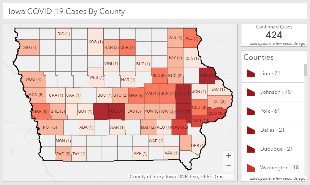 DES MOINES, Iowa — The Iowa Department of Public Health (IDPH) was notified Saturday of 88 additional positive cases of Iowans with COVID-19, for a total of 424 positive cases statewide and 21 cases in Dallas County. There have been a total of 6,162 negative tests to date, which includes testing reported by the State Hygienic Lab and other labs.
