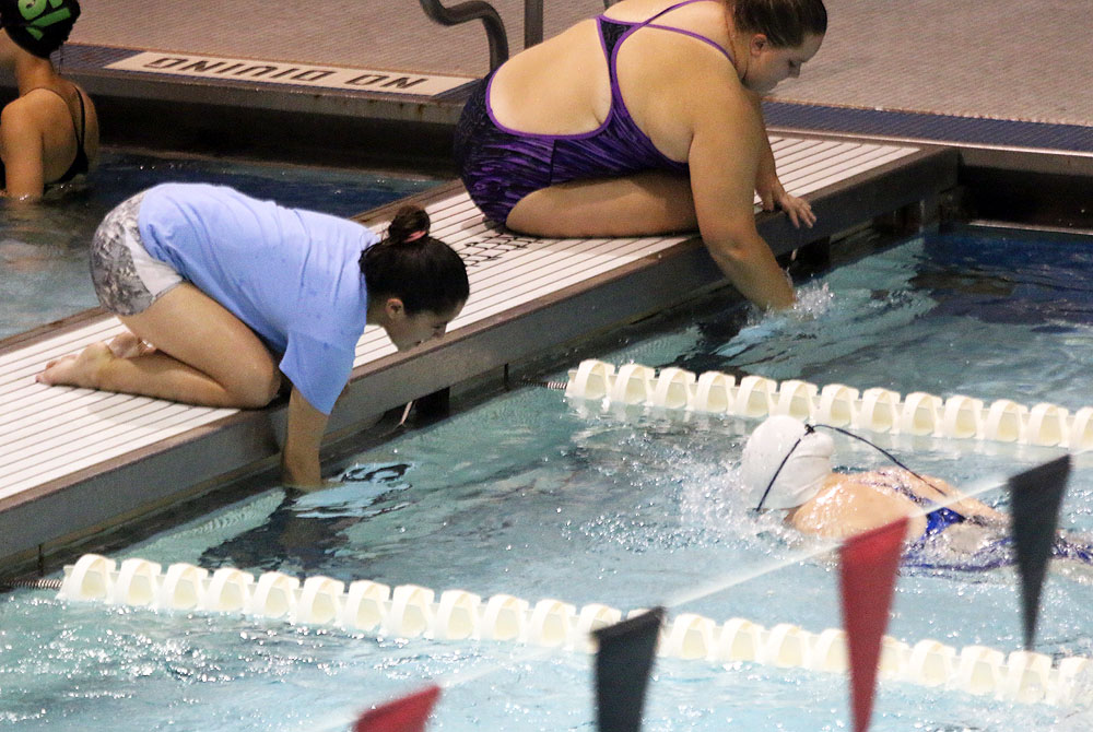 Vivian Gonzalez holds a lap counter against the wall as Breanna Penenger prepares to make a turn in the 500 freestyle during Perry’s visit to the Fort Dodge Invitational Thursday. The event is the longest in high school swimming, requiring swimmers to make 20 laps (down-and-back 10 times) in 25-meter pools. Photo courtesy of Jim Dowd.