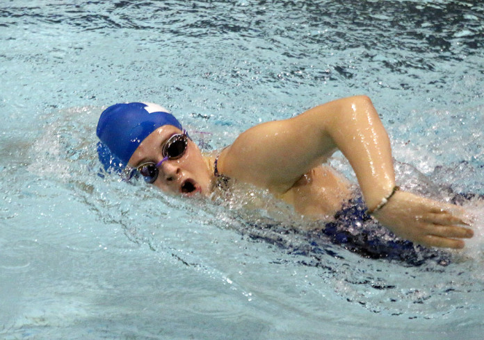 Perry senior Haileigh Kenyon swims to a personal-best time of 2 minutes, 15.51 seconds in the 200 freestyle at the Fort Dodge Invitational Thursday. Photo courtesy of Jim Dowd.