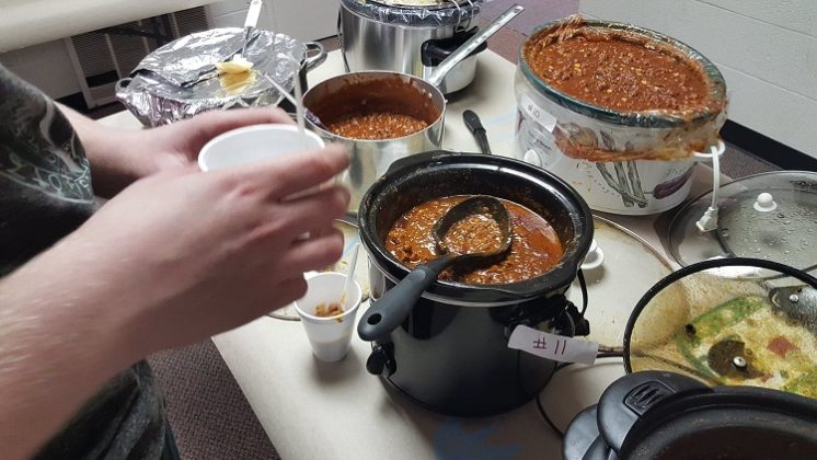 Guest judges Nick Bailey and Jim Caufield scientifically sampled the wide variety of chili, rating each concoction on its color, odor, texture, taste and temperature. The hominy chili was a change of pace.