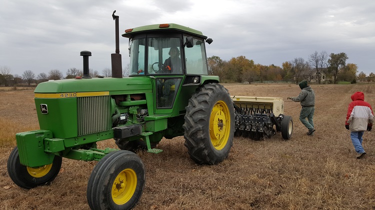 Seeding started early in the day Nov. 1. Local farmer Donnie Merkey provided a tractor to pull the native seed drill that Golightly rented from the Dallas County Conservation Board for the project. Perkins drove the tractor, and Dallas County Conservation Natural Resource Manager Greg Sieck and FTF Restoration crew person Jeffrey Topalovich assisted.