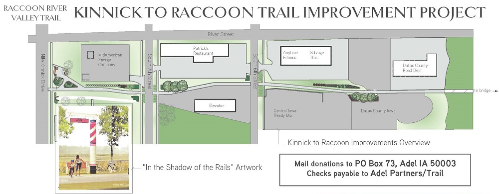 After two years of steady work spearheaded by Adel Partners Chamber of Commerce Director Deb Bengston and Adel Partners member Rebecca Hilmer, the Kinnick to Raccoon Trail Improvement Project Committee raised $108,000 of its $125,000 goal for the beautification plan, with the balance of funding expected to come from a REAP grant.