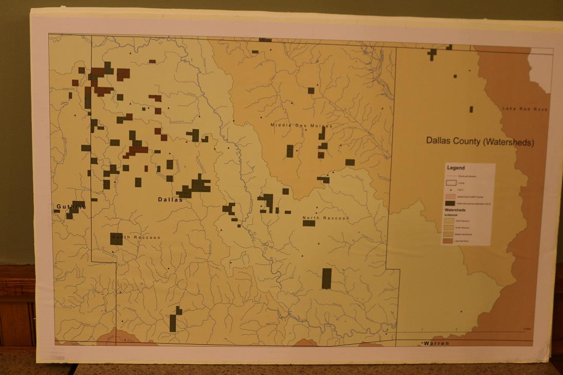 Janet Zimmerline of Adair County drew listeners’ attention to the issue of “double-dumping” or over-application of manure. She said ICCI’s cross-referencing of MMPs found numerous instances in which multiple producers were claiming the same field as part of their MMP. In Adair County, for example, “four producers were dumping on this little section,” she said, pointing to the map.
