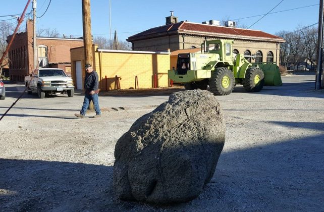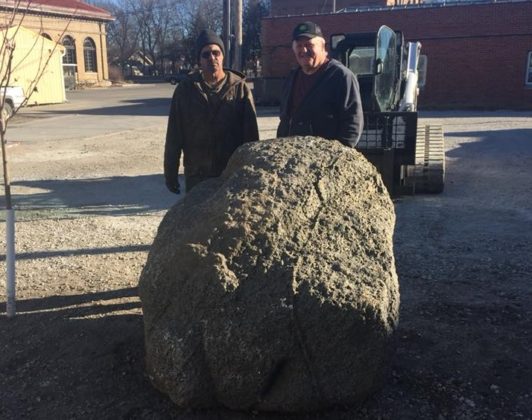 “I want to call it the Hero Rock,” said La Paris owner Jacqueline Riekena. “It has arrived and has been perfectly placed between the two maple trees in the back of the building.”  Riekena said special thanks was due to Dennis Allen and Steve Stalzer for delivering and placing the rock.