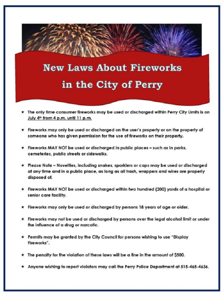 “Fireworks are only allowed on the Fourth of July from 4-11 p.m.,” a Perry Police Department statement said. “Party poppers and sparklers still may be used as always.”