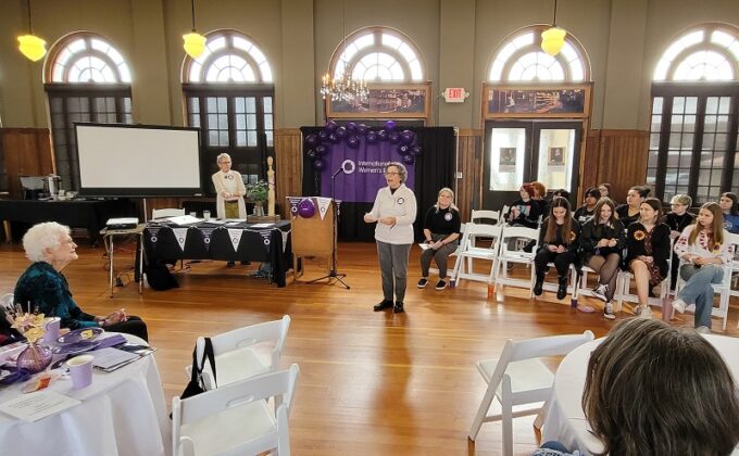 The four World Link exchange students extending their IWD greetings to the crowd were Yelyzaveta Yaryshkina, 16, of Ukraine; Iryna Hodun, 18, of Ukraine; Lyudmyia Shapovalova, 18, of Ukraine; and Natali Tuniashvili, 17, of Georgia. Shapovalova spoke movingly about the tragic course of Russia’s war against Ukraine.