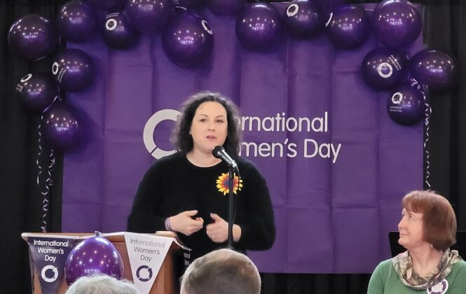 Carol Cavanaugh of Perry, who founded the local event, served as the event’s mistress of ceremonies. She briefly recounted her organization of the first International Women’s Day celebration in Perry and explained the theme of the 2023 celebration: Embrace Equity.