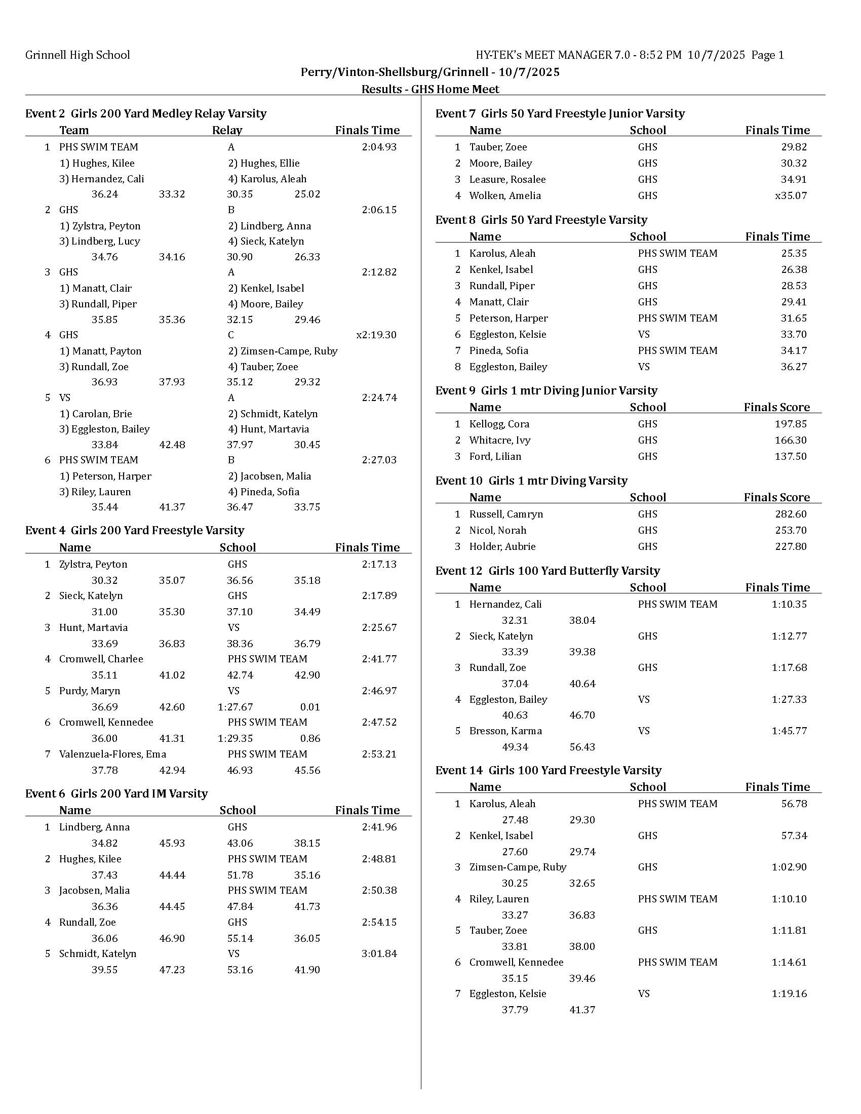 Grinnell had three varsity divers. Perry swimmers set three personal best times in individual events in one relay leg.