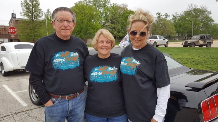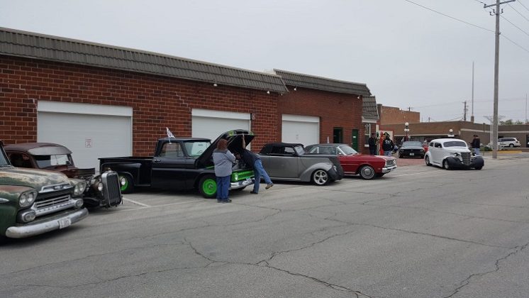 Cory Dunn of Altoona orgainzed the e-RAT-icate Cancer Cruise Iowa tour. He was met for pictures at the Perry Oil Co. by his wife, Shelly Dunn, his parents, Mike and Rhonda Dunn of Ankeny, and some 25 other Iowa rat rodders but also including a few shiners, motorcycles and even a couple daily drivers, all of them ready to join the cause against cancer.