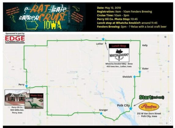 About 25 rat rodders and others took the four-hour e-RAT-icate Cancer Cruise Iowa Saturday, starting in Polk City and passing through Granger, Perry, Luther, Slater and Sheldahl. The Perry Oil Co. stop was the tour's planned photo opportunity.