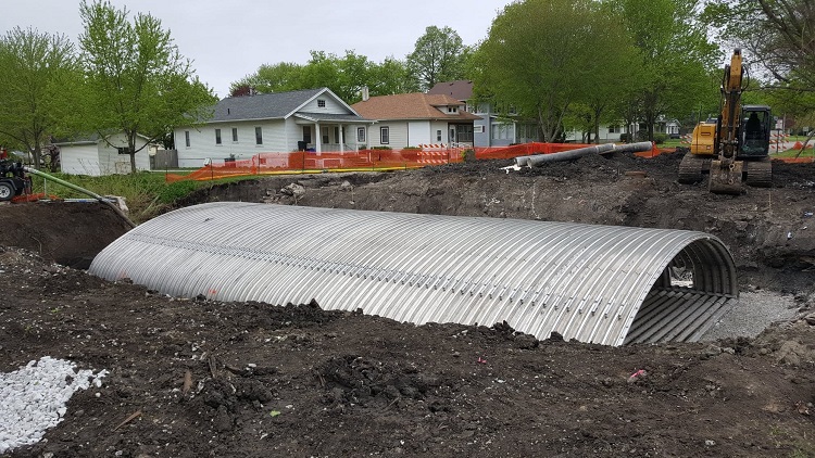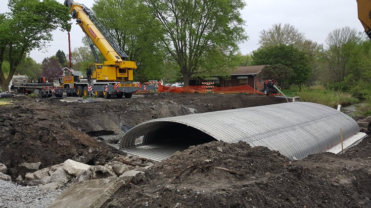 The Contec culvert replacing the 100-year-old Frog Creek Bridge on Willis Avenue was placed in the creek bed late Friday morning, and the backfill process will now begin.