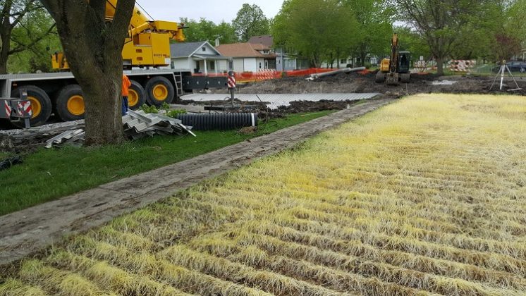 The pipe carrying lime from the Perry Waterworks to the lime lagoons on Perry’s southwest side was temporarily shutoff during placement of the culvert. A hole in the culvert will permit the lime line to pass through.