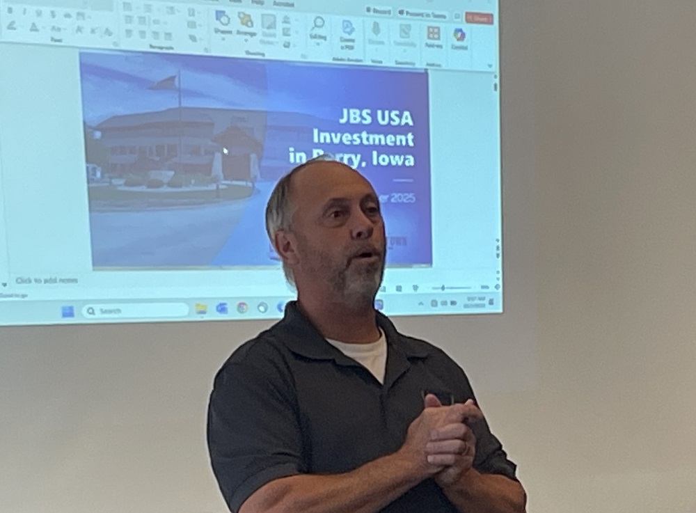 Mark Chase, general manager of the new JBS Prepared Foods Inc. plant under construction near the Perry Industrial Park, speaks to the members of the Dallas County Area Retired School Personnel Association (DCARSPA). Photo courtesy DCARSPA