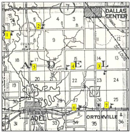 Adel #5, built in 1920, was located two miles south and a half-mile east of Dallas Center in Section 23. According to Robert Cadwell, “Mary Miller started teaching at this school in 1928 and taught there for 15 years. The school closed in 1945, and the building was moved to the Dallas Center High School in 1946 for classrooms along with two other rural schools. The Adel #5 school building still remains located on the Dallas Center School property.”
