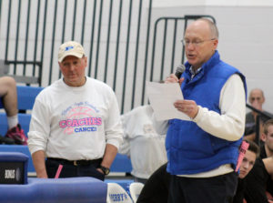 Perry Superintendent Clark Wicks (right) introduces Kirk VanKirk, who spoke between games on his own battle with cancer and on the disease in general.