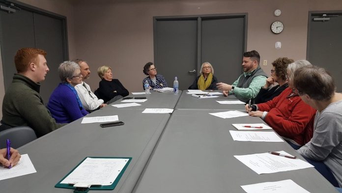 Troy Price, fourth from right, chairperson of the Iowa Democratic Party, and Bryce Smith, left, chair of the Dallas County Democrats, met with Perry-area Democrats in January 2019, little knowing the SNAFU lying wait for the 2020 Iowa caucuses.