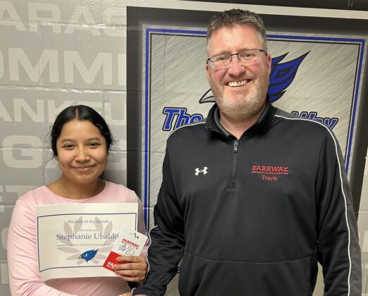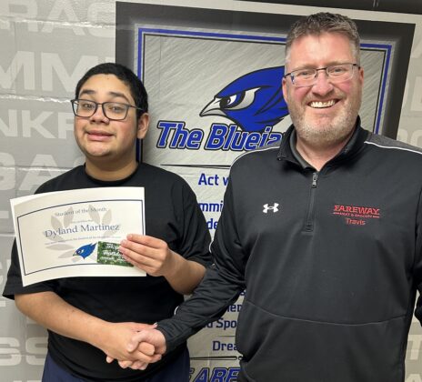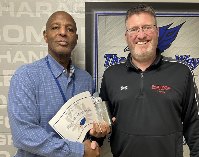 Kenneth Hegwood, left, receives the Staff of the Month: Student Choice award. The award was presented by Perry School Board member and Fareway Manager Travis Landgrebe. Photo courtesy PCSD