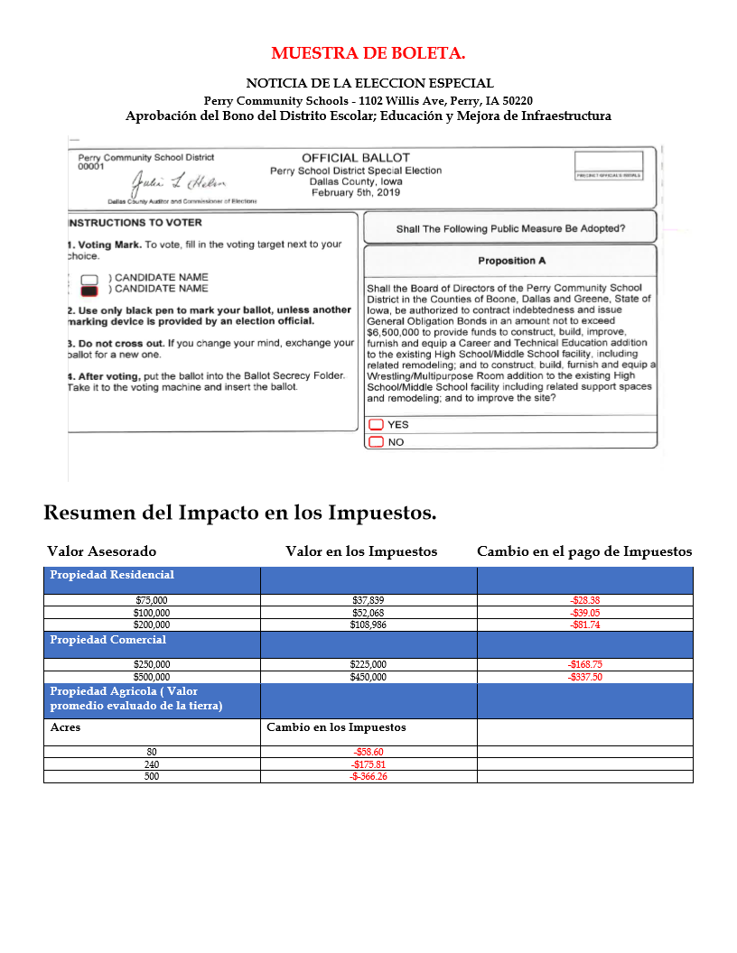 Shall the Board of Directors of the Perry Community School District in the Counties of Boone, Dallas, and Greene, State of Iowa, be authorized to contract indebtedness and issue General Obligation Bonds in an amount not to exceed $6,500,000 to provide funds to construct, build, improve, furnish, and equip a Career and Technical Education addition to the existing High School/Middle School facility, including related remodeling; and to construct, build, furnish, and equip a Wrestling/Multipurpose Room addition to the existing High School/Middle School facility, including related support spaces and remodeling; and to improve the site?