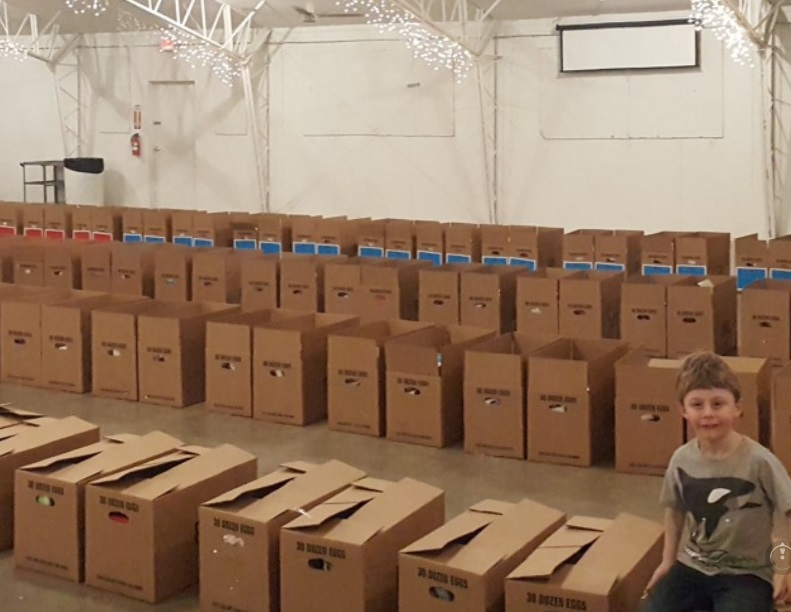 Blake Allen Todd of Perry, grandson of Perry Firefighter Joel Eiteman, watches over the 150 boxes ready for delivery in the Dallas County Sheriff’s Benevolent Association annual Christmas food basket program. Photo courtesy Dallas County Sheriff’s Benevolent Association