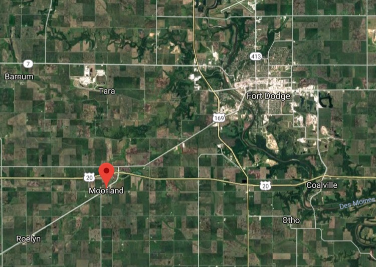 The Webster County town of Moorland, population 169, lies about six miles southwest of Fort Dodge near U.S. Highway 20.